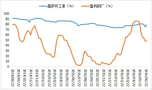 截止6月末,全國鋼廠高爐開工率為79.42%,較年初上升5.39個百分點,螺紋鋼、線材達產率分別為69.8%和63.8%,供應端較5月水平有所下降,市場供需壓力得到一定緩解。盈利鋼廠比例為48.47%,較年初上升41.11個百分點。今年以來在鋼價回升的拉動下,鋼廠的盈利狀況有所好轉,3-4月鋼價明顯上漲時,許多鋼廠的盈利已達700-800元/噸,個別成本控制較好的企業盈利甚至超過1000元/噸,鋼廠的盈利情況大幅好轉。