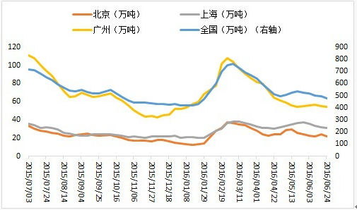 截止6月24日,全國26個主要城市線螺總庫存475.71萬噸,較年初上漲13.97%,同比下降33.34%;北京總庫存21.39萬噸,較年初上漲51.7%,同比下跌35.24%;上海總庫存30.82萬噸,較年初上漲49.61%,同比下降14.48%;廣州總庫存54.2萬噸,較年初上漲3.83%,同比下降51.08%。3月之后,廠庫、社會庫存雙雙持續回落,目前雖然需求沒有明顯放量,但市場供需整體弱平衡,短期來看無較大壓力。分地區來看,目前西南地區以144.55萬噸的庫存量居全國之首,其次是華東地區108.83萬噸,東北、西北地區庫存相對較低,各地區庫存均較上月有所回落。由于去年價格的暴跌,貿易商囤貨的情況越來越少,社會庫存處于歷年來最低的水平,按照往年經驗,一般鋼材社會庫存在3月初見頂后全年將處于去庫存的過程中,而2015年直到10月底,庫存才降至1000萬噸以下,今年去庫進度較去年快了超過6個月,這一方面是由于貿易商對囤貨的消極態度,另一方面由于旺季來臨疊加經濟復蘇帶來的鋼材需求的快速擴張。