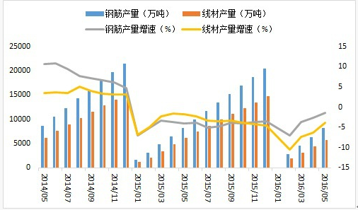 截止2016年5月末,鋼筋累計產量8144萬噸,同比下降1.4%,線材累計產量5779.4萬噸,同比下滑3.8%。從月度產量走勢看,2016年上半年鋼筋和線材產量逐月回升,同比降幅不斷收窄。受鋼價回升以及庫存持續走低影響,2016年建筑鋼材產量回升態勢明顯。進入5月后,粗鋼日均產量連創新高。據統計,前期為了延緩生產、減少虧損而停產檢修的企業,在鋼價上漲啟動后紛紛復產,復產產能共有9275萬噸,占去年產能水平近8%。大規模復產必將帶來下半年市場供應壓力的增大。
