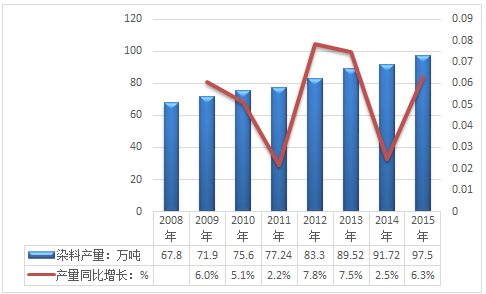 2014年我國(guó)染料產(chǎn)量為91.72萬(wàn)噸,產(chǎn)量同比增長(zhǎng)2.5%,2015年國(guó)內(nèi)染料產(chǎn)量在97.5萬(wàn)噸左右。