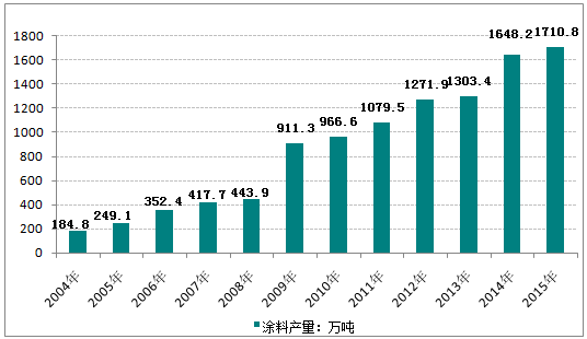 2004 -2015年我國(guó)涂料產(chǎn)量走勢(shì)圖