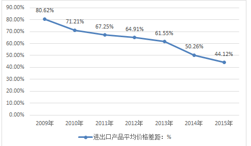 2009-2015年我國(guó)涂料產(chǎn)品進(jìn)出口產(chǎn)品平均價(jià)格差距:%