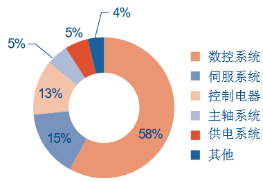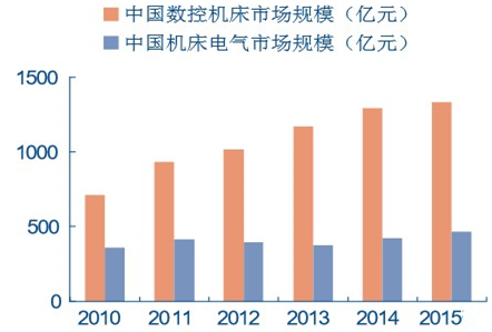 據統計,當前中國數控機床市場約 40 萬臺超千億規模,其中機床電氣市場近 400 億, 數控系統和伺服系統是機床電氣的主要部分。常規情況下每臺數控機床會使用一臺 CNC 專 用控制器作為控制部件,一臺 PLC 通用控制器作主軸控制,還有 2~3 套伺服系統完成切削 等精確位置控制。在這些核心部件的基礎上會產生一系列配套、工程設計等系統集成業務中國數控機床及機床電氣市場規模