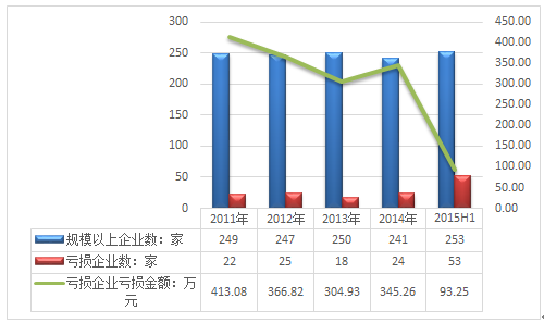 2011-2015年上半年我國電容器及其配套設(shè)備制造行業(yè)企業(yè)虧損情況
