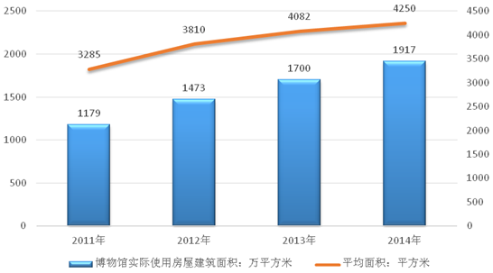 2013年我國博物館行業實際使用房屋建筑面積為1700萬平方米,博物館行業平均實際使用房屋建筑面積從2011年的3285平方米/家增長至2013年的4082平方米/家,2014年我國博物館行業實際使用房屋建筑面積在1917萬平方米左右,平均實際使用房屋建筑面積約為4250平方米。