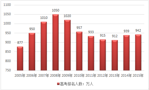 核心提示:據教育部統計,2014年全國高考報名人數為939萬人,較2013年增加27萬人,增幅3%。其中普通高中應屆生增加26萬人;中職畢業學生增加11萬人;復讀生減少10萬人,2015年942萬人報名高考。2005-2015年我國高考報名人數統計據教育部統計,2014年全國高考報名人數為939萬人,較2013年增加27萬人,增幅3%。其中普通高中應屆生增加26萬人;中職畢業學生增加11萬人;復讀生減少10萬人,2015年942萬人報名高考。