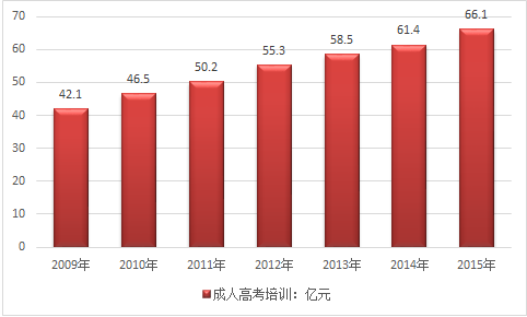 中經先略數據中心發布的《2016-2022年中國教育培訓市場競爭格局及投資前景評估報告》顯示,設立之初,是為解決在崗人員的學歷教育和繼續教育問題,參加者多為成年人,是國家高等教育重要組成部分。近年來我國成人高考年報名人數在300萬人以上, 2015年我國成人高考培訓市場規模超過60億元。