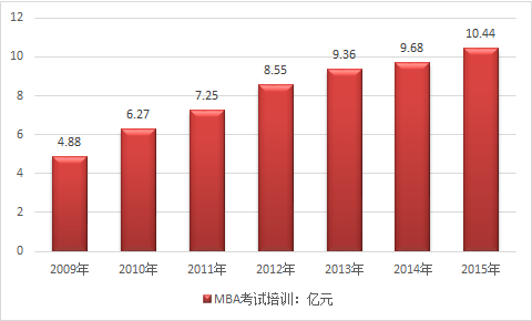 據統計:2014年我國MBA考試培訓市場規模為9.68億元,2015年行業規模在10.44億元左右。