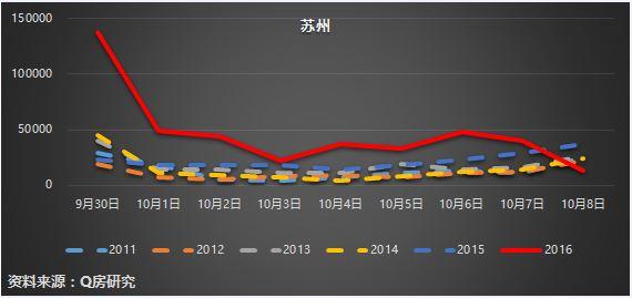 10月3日,蘇州出臺政策后,市場同樣出現降溫。按照Q房網監測的數據,今年9月30日至10月7日成交面積呈現下滑態勢。9月30日成交面積為137800平方米,10月1日成交縮至49300平方米,10月2日成交面積也在四萬多平方米徘徊,到了10月3日,僅成交22100平方米,國慶期間共計成交面積為41.09萬平方米。