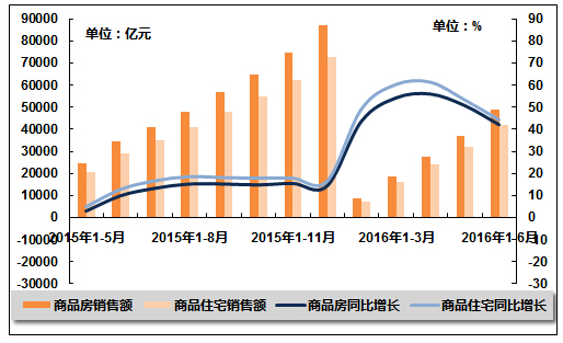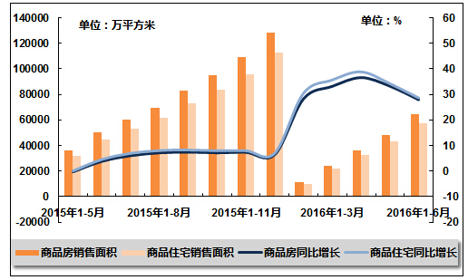 2016年1-6月,由于基數抬高、政策調控和需求降溫等一系列因素影響下,全國商品房銷售面積及銷售額增速繼續回落。國家統計局發布的數據顯示,2016年1-6月,全國商品房銷售面積64,302.5萬平方米,同比增長27.9%,增幅同比提高24.0個百分點,但比2016年1-5月回落5.3個百分點。其中,商品住宅銷售面積57,093.8萬平方米,同比增長28.6%,增幅同比提高24.1個百分點,比2016年1-5月回落5.6個百分點;同期,全國商品房銷售額48,682.4億元,同比增長42.1%,增幅同比提高32.1個百分點,比2016年1-5月回落8.6個百分點。其中,商品住宅銷售額41,801.9億元,同比增長44.4%,增幅同比提高31.5個百分點,比2016年1-5月回落9.0個百分點。