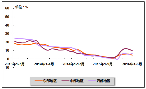 2013年7月-2016年6月累計東、中、西部地區房地產投資增長率變動趨勢