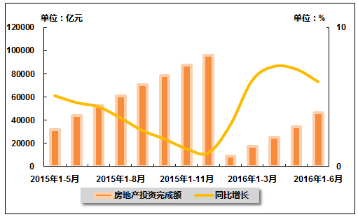 2016年1-6月,由于房屋新開工面積增速進一步放緩,房地產開發投資增速進一步回落,連續兩個月下滑。國家統計局發布的數據顯示:2016年1-6月,全國完成房地產開發投資46,630.5億元,同比增長6.1%,增幅同比提高1.5個百分點,比2016年1-5月回落0.9個百分點。