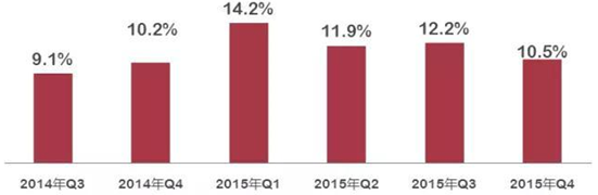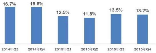 2014年Q3~2015年Q4我國電子器件行業(yè)銷售產(chǎn)值增速對比情況(%)