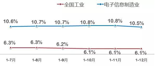 1-12月,規(guī)模以上電子信息制造業(yè)增加值同比增長10.5%,高于工業(yè)平均水平(6.1%)4.4個百分點。其中12月當(dāng)月同比增長7.6%,高于工業(yè)平均水平(5.9%)1.7個百分點。1-12月,電子信息制造業(yè)的銷售產(chǎn)值同比增長8.7%,內(nèi)銷值同比增長17.3%。