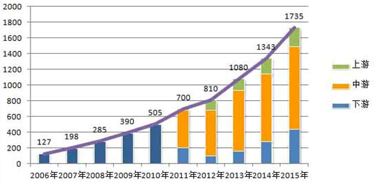 2006-2015年我國衛星導航與位置服務產業產值分布圖(單位:億元)