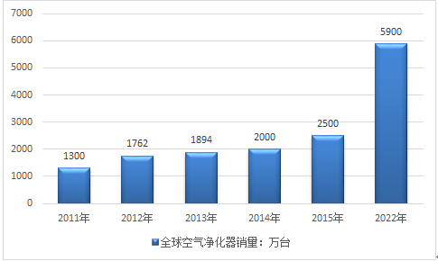 2009年起,全球各大家電企業及空氣凈化裝置專業公司均不同程度的擴充了空氣凈化器的產能,產品從高功能到普及型延伸,形成相對完備的商品陣營,根據富士經濟發布的最新統計數據。受微小顆粒物“PM2.5”等導致大氣污染的影響,2013年全球空氣凈化器的銷量趨于增加。2013年全球空氣凈化器銷量較 2012年增加了7.5%,達到1894萬臺,2015年在2500萬臺左右。預計到2022年全球空氣凈化器將達到5900萬臺。