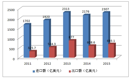 根據海關統計,2015年進口集成電路3139.96億塊,同比增長10%;進口金額2307億美元,同比增長6%。出口集成電路1827.66億塊,同比增長19.1%;出口金額693.1億美元,同比增長13.9%。2015年進出口逆差1613.9億美元。