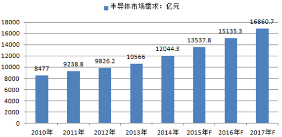 應用領域2015年2016年2017年IC設計業1307.21637.92039.1增長率24.80%25.30%24.50%芯片制造業874.51038.91224.8增長率22.80%18.80%17.90%封裝測試業1475.71708.81953.2增長率17.50%15.80%14.30%合計3657.44385.65217.1截至2014年底,中國占全球半導體消費市場的份額已達到了創紀錄的56.6%。過去11年中國市場復合年增長率達到了18.8%,而同期全球芯片消費的復合年增長率僅為6.6%。