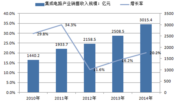 2010-2014 年中國集成電路產業銷售收入規模及增長
