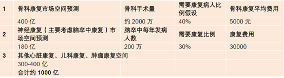 雖然目前國內(nèi)康復市場規(guī)模僅約200 億元,但我們發(fā)現(xiàn)上世紀末在美國發(fā)生的一系列推動康復醫(yī)療大發(fā)展的驅(qū)動因素正在中國發(fā)生,包括人口老年化、醫(yī)保支付方式變革推動治療醫(yī)院向康復醫(yī)院轉(zhuǎn)診病患、民眾對高品質(zhì)生活的追求、技術進步等。我們測算,骨科康復和神經(jīng)康復將是空間巨大的康復治療子領域,根據(jù)每年的手術量并假設一定比例的術后病人選擇康復及平均康復費用,我們測算骨科康復和神經(jīng)康復的市場空間分別高達400 億和180 億(詳細測算見下表)。再考慮其它康復子領域,未來5-10 年國內(nèi)將迎來千億康復市場規(guī)模。