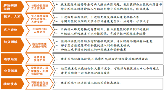 社會資本積極進入康復醫(yī)療領域,需要采取合適的策略。在解決病源方面,與綜合醫(yī)院建立轉(zhuǎn)診通道;在技術和設備、人才方面,引進國外先進的治療流程與技術并合作培養(yǎng)康復人才;在客戶定位方面,既覆蓋低端醫(yī)保人群又覆蓋中高端人群提高盈利水平;在細分領域方面,結合企業(yè)自身優(yōu)勢和細分領域市場空間;在未來業(yè)務拓展方面,向社區(qū)康復及長期護理領域延伸等。