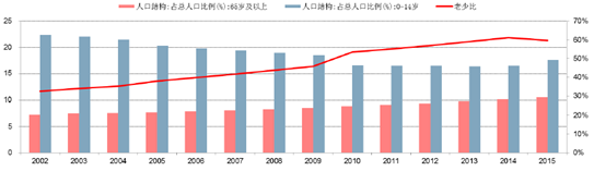 2000年11月底第五次人口普查,我國65歲及以上老年人口已達8811萬人,占總人口6.96%,60歲以上人口達1.3億人,占總人口10.2%,以上比例按國際標準衡量,均已進入了老齡化社會。此后,我國65歲及以上人口占比逐年提高,據統計,2015年我國65周歲及以上人口1.44億,占總人口10.50%,高出2014年0.4個百分點。同時,我國人口老少比(即65歲及以上人口與1-14歲人口的比值)也在逐年上升,從2002年的32.59%上升到2014年的61.25%,上升幅度較大。直到2015年才有所下降,為59.66%。通常,65歲以上的人口比率超過總人口的14%就被稱為“老齡社會”。從老齡化社會進入老齡社會,法國用了115年,英國用了47年,德國經過了40年,而日本只用了24年,速度之快非常驚人。根據聯合國的人口統計數據,中國將在2024年至2026年前后進入老齡社會,速度與日本大體相同。