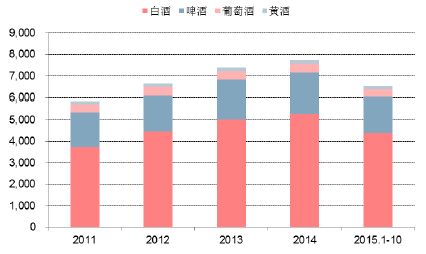 2011-2015年我國規模以上酒類生產企業主要酒類營收(億元)