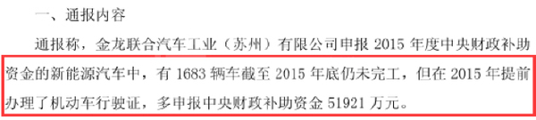 上市新能源車企金龍汽車的公告就揭示了其中的一則騙補(bǔ)手法。下圖是面包財(cái)經(jīng)對(duì)金龍汽車公告的截圖: