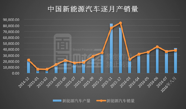 但已經(jīng)被曝光的騙補(bǔ)事件表明:這樣的銷量背后無(wú)疑是有水分的,如同金龍汽車的“騙補(bǔ)套路”一樣,統(tǒng)計(jì)數(shù)字中的很多新能源車根本沒(méi)有實(shí)際生產(chǎn)出來(lái)。尤其是去年11月和12月銷量的暴增,非常突兀。下圖是面包財(cái)經(jīng)根據(jù)中國(guó)汽車工業(yè)協(xié)會(huì)數(shù)據(jù)繪制的新能源汽車逐月產(chǎn)銷量: