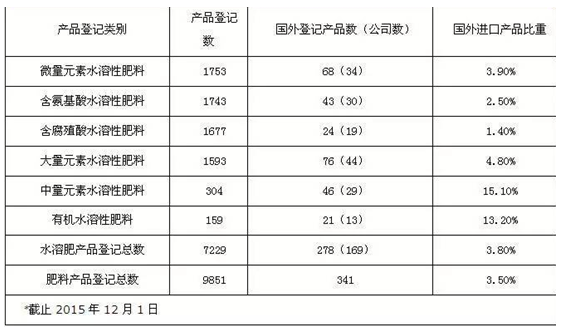 截止2015年12月1日,全國肥料產品登記總數為9851個,其中水溶肥產品數為7229個,占總數73.38%,而進口水溶肥產品登記數為278個,占登記水溶肥產品總數3.8%。這表明,水溶肥已成為肥料產品登記主流發展方向,而國外進口水溶肥產品登記數量相對國內產品依然相對較少。