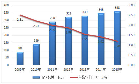 2009-2015年我國水溶性肥料價格及市場規模走勢分析