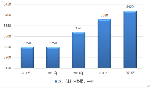 2012-2016年歐洲稻米消費量走勢圖