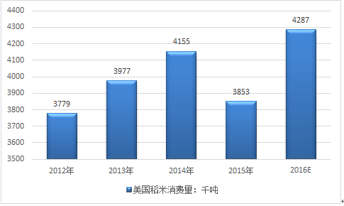 2015年美國國內稻米消費量為385.3萬噸,消費量較上年下降7.27%,預計2016年美國稻米消費量在428.7萬噸左右。