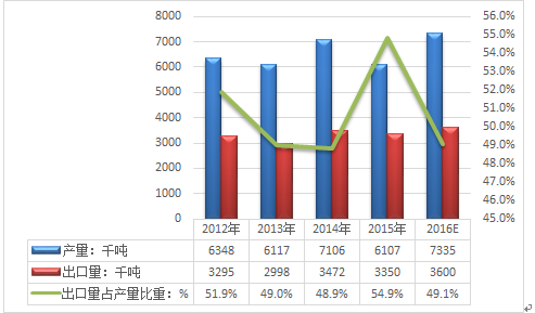 -2012年2013年2014年2015年2016E產量:千噸63486117710661077335消費量:千噸37793977415538534287出口量:千噸32952998347233503600進口量:千噸675755758765775庫存量:千噸11561025155213611599資料來源:公開資料整理