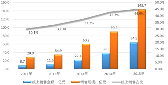2011-2015年我國空氣凈化器線上銷售市場金額統計圖