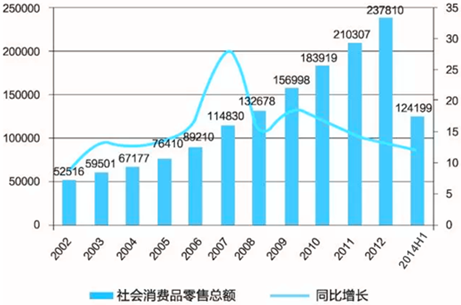 2002-2014年我國社會消費品零售總額及增長情況