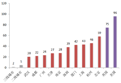 我國部分一線城市視頻監控滲透率(個/千人)與發達國家平均水平對比