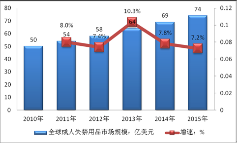 2010-2015年全球成人失禁用品市場(chǎng)規(guī)模及增速:億美元,%
