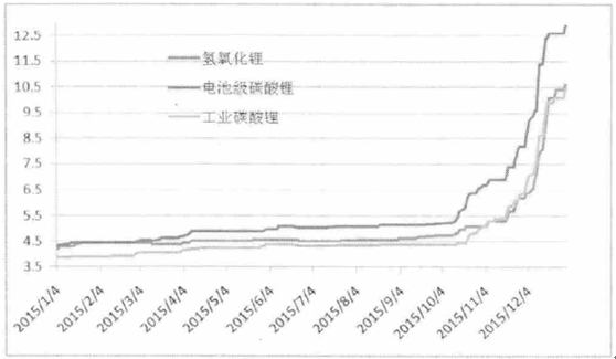 2015 年初,電池級碳酸鋰價格每噸為4.3 萬元,一季度末平均價格為每噸4.7 萬元,上漲9.3% ;二季度末平均價格每噸5.1 萬元左右,比年初上漲18.6% ;三季度末價格每噸5.2萬元,比年初上漲20.9% ;年底價格為每噸12.9 萬元,比年初上漲200%。
