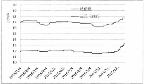 2015 年鈷酸鋰和鎳鈷錳酸鋰(523 型)價格走勢