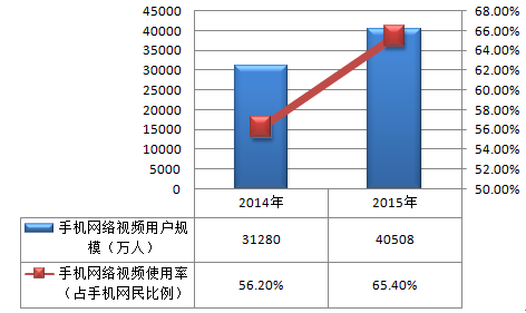 2015年,手機視頻用戶規模為4.05億,與2014年底相比增長了9228萬,增長率為29.5% 。手機網絡視頻使用率為65.4%,相比2014年底增長9.2個百分點。