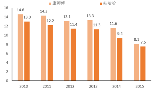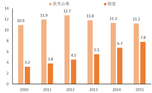 2011-2015 年,瓶裝水行業(yè)的 CAGR 達到 15.5%,高出整個軟飲料行業(yè) 2PCT, 位列所有子行業(yè)第二位。具體到每年的行業(yè)增速上去,瓶裝水行業(yè)增速亦由 2011 年 的增速墊底攀升至 2015 年的子行業(yè)增速領先,五年來增長率均保持在 10%以上的中 高速增長。因此,瓶裝水在替代品威脅這一塊上攻守兼?zhèn)洌环矫婺塬@得比整個軟飲料行業(yè)更高的增長速度,另一方面還兼具對其他品類市場份額的替代能力。