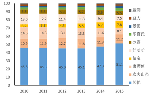 2010-2015我國瓶裝水品牌市占率變化