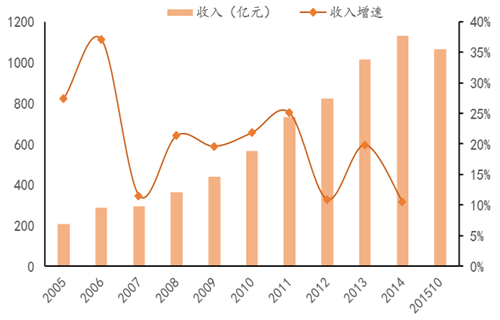 2005-2015.10我國瓶裝水收入與增速
