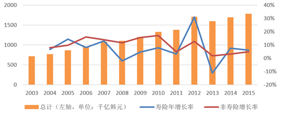 2009 年以來長期的低利率政策,使得韓國保費收入增幅僅維持在 5%左右。 2012 年,韓國保費出現短期小幅高增長, 這主要是得益于非連結型傳統保險產品的銷售穩健及韓國 Nonghyup(農業合作社)重組 NH Life 進入市場,但受到長期低利率、韓國經濟低迷、韓國稅收優惠政策三方面的限制,躉交 儲蓄產品的銷售受到了嚴重影響,韓國保費收入情況在 2013 年再次出現回落。