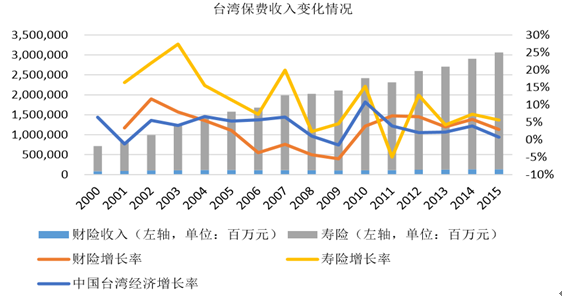 2008 年經濟危機以來,臺灣保險業受 到一定沖擊,但基本維持著 5%左右的增速,高于近年來 3%左右的經濟增長率。2011 年, 由于地區推行“全民年金”政策,商業性個人年金銷售受到較大影響,銷量大幅下滑,導致壽 險收入大幅下滑,影響了總體臺灣保險業發展情況。相比之下,臺灣財險整體發展則保持相 對穩定的增幅。