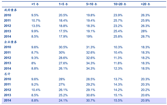 2014 年,美國險資中,較為短期的投資金額為 884 億美元,僅占全部資產配置的 1.8%。與此相比,長期性投資占比則達到 48.5%。而在固收 類投資方面,美國壽險也偏好中長期政府債券與企業債券,且中、長期債券配置比例逐年增加。