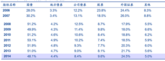 無論是財險還是壽險,資產配置上均以有價證券為主,特別是在近年利率不斷下行的環境下, 有價證券配置占據超過 80%。資產配置中,國債占比超過半壁江山,股票占比大幅下降,從 2006 年 25%左右跌至 2014 年的不足 10%。這顯示了在持續低利率情況下,日本資產配置 以保持穩健性為首要目的,傾向于配置低風險的政府債券(尤其是國債), 注重資產負債久期匹配。
