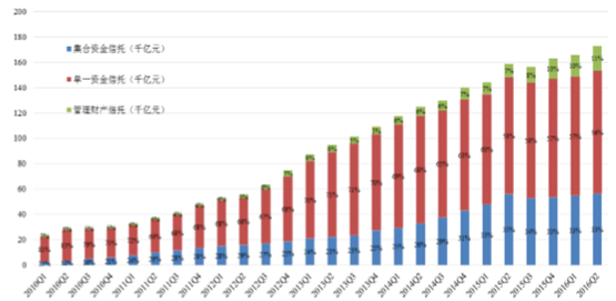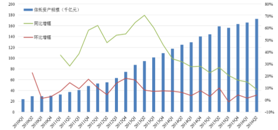 2016年二季度末,68家信托公司的信托資產規模為17.29萬億元,較同 期增加 1.42 萬億元,同比增幅 8.95%,環比增幅僅為 4.25%。整體看, 增長放緩,增量效益貢獻下滑。2015 年三季度末甚至出現 2010 年以來 的首次季度下降。規模放緩原因在于宏觀經濟下行和經濟結構調整背景下,新 增信托規模增長乏力,同時存續信托資產進入兌付高峰。且 15 年三季 度,國家對場外配資尤其是對傘形信托的清理,以及證監會要求將信 托接口轉接到券商,導致不少投資股票的信托產品被迫清盤,這也是原因之一。