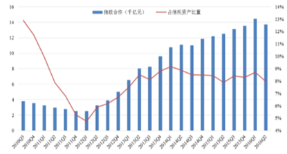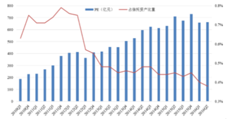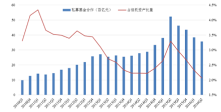 目前規模占比第三位的是私募基金合作業務。截止 2016 年第二季度 末,該類業務規模 0.36萬億元,占比 2.06%。總體上私募基金合作業務 所占比重呈下降趨勢,自 2015 年第二季度以來,絕對規模也開始減 少。與其類似,PE 業務的絕對規模也從 2015 年第二季度開始下降,截 止 2016 年第二季度末,該類業務規模 662.96 億元,占比 0.36%。